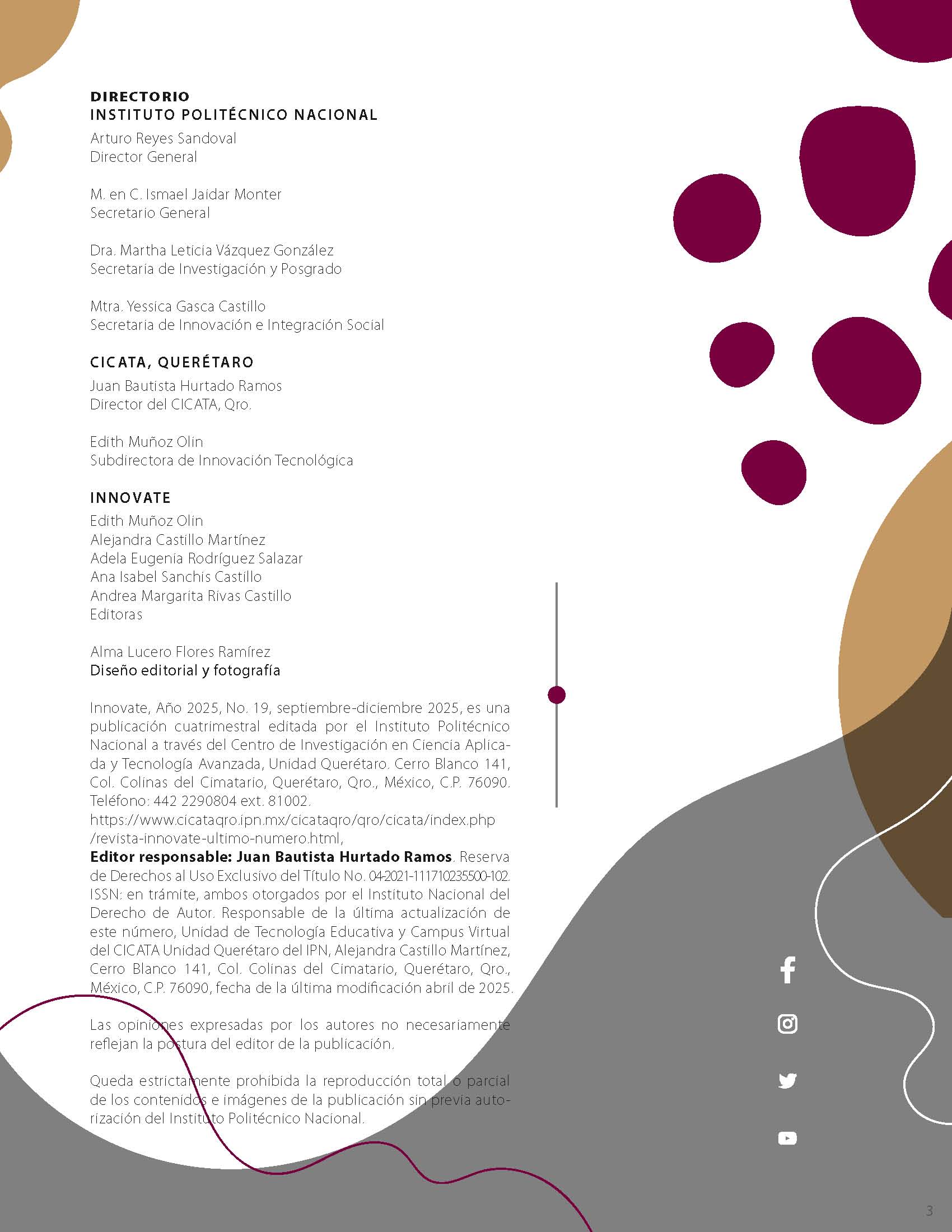D.R. Instituto Politécnico Nacional (IPN). Av. Luis Enrique Erro S/N, Unidad Profesional Adolfo López Mateos, Zacatenco, Alcaldía Gustavo A. Madero, C.P. 07738, Ciudad de México, 2019. Conmutador: 55 57 29 60 00 / 55 57 29 63 00. Esta página es una obra intelectual protegida por la Ley Federal del Derecho de Autor, puede ser reproducida con fines no lucrativos, siempre y cuando no se mutile, se cite la fuente completa y su dirección electrónica; su uso para otros fines, requiere autorización previa y por escrito de la Dirección General del Instituto. |